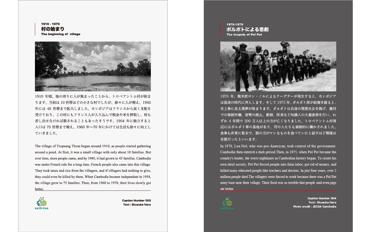 全体的な構成は統一しつつ、カンボジアの闇の歴史である内戦時代とNPO法人earth treeが関わり始めた後でキャプションのデザインを変化させました。