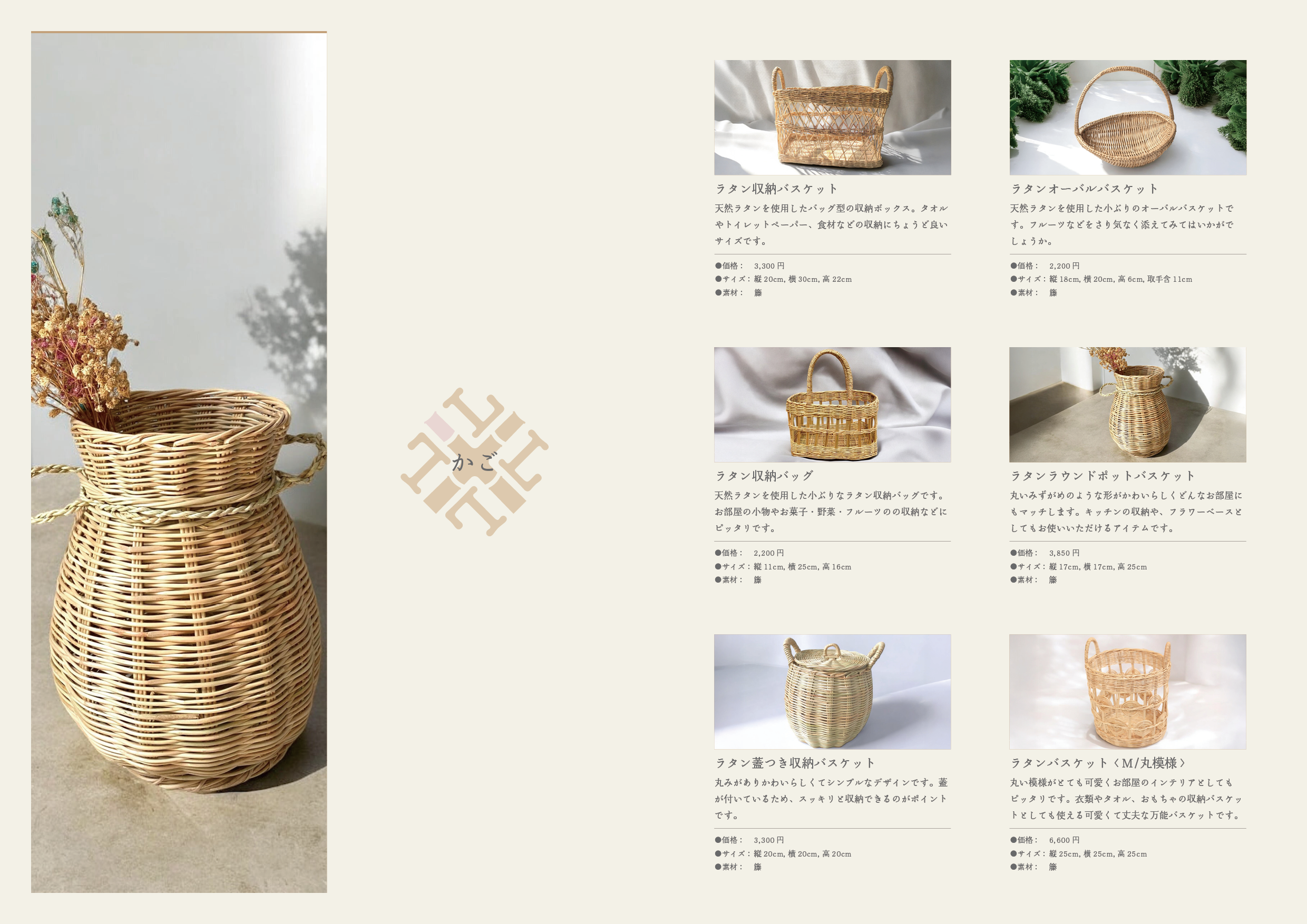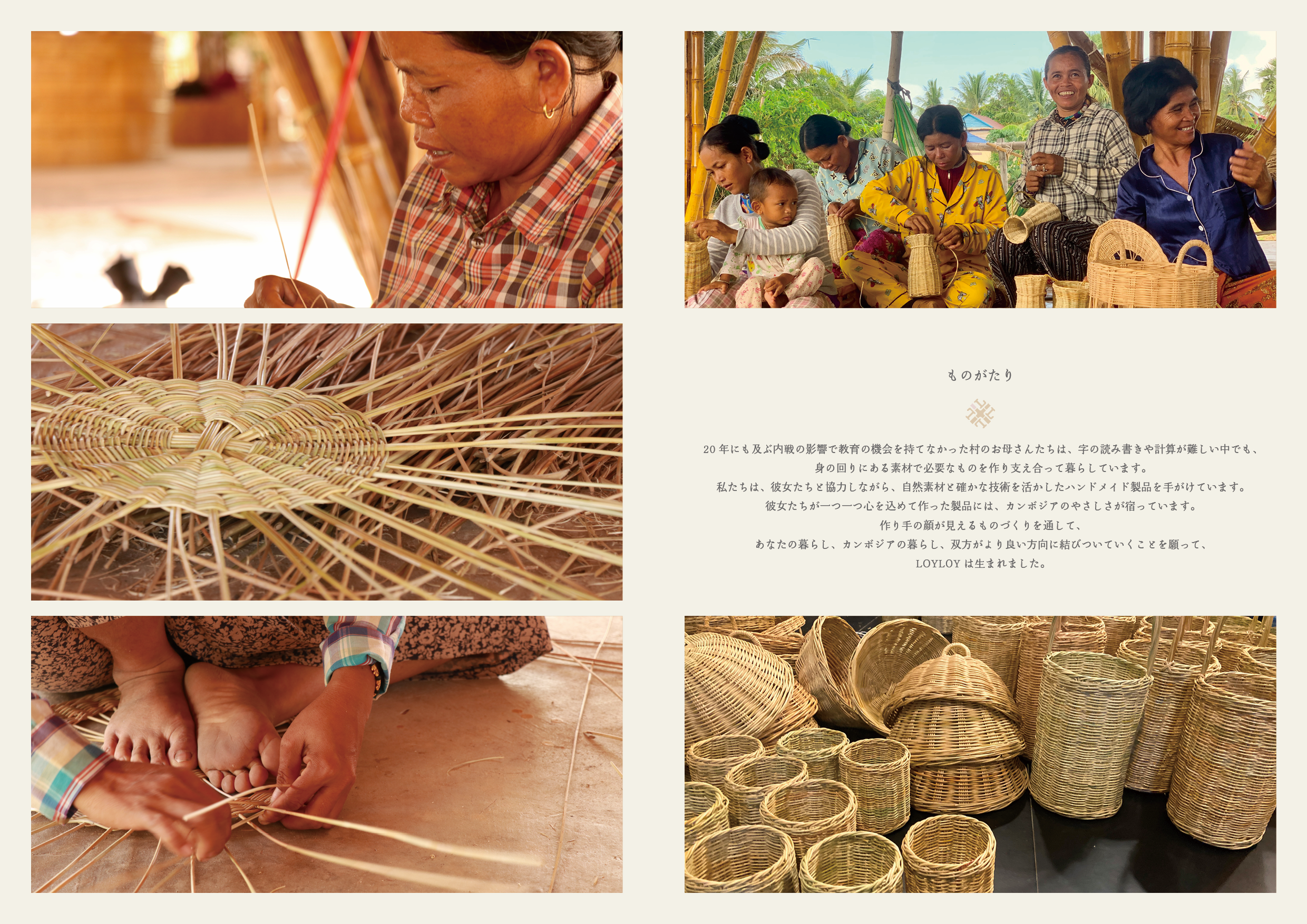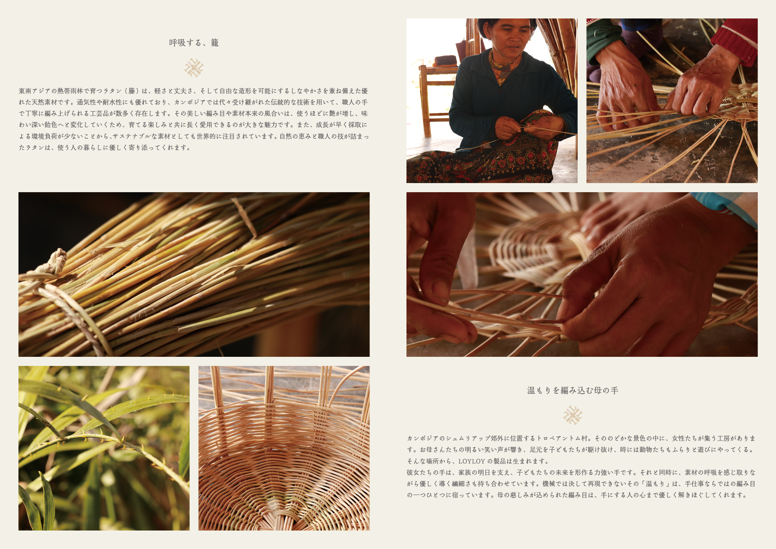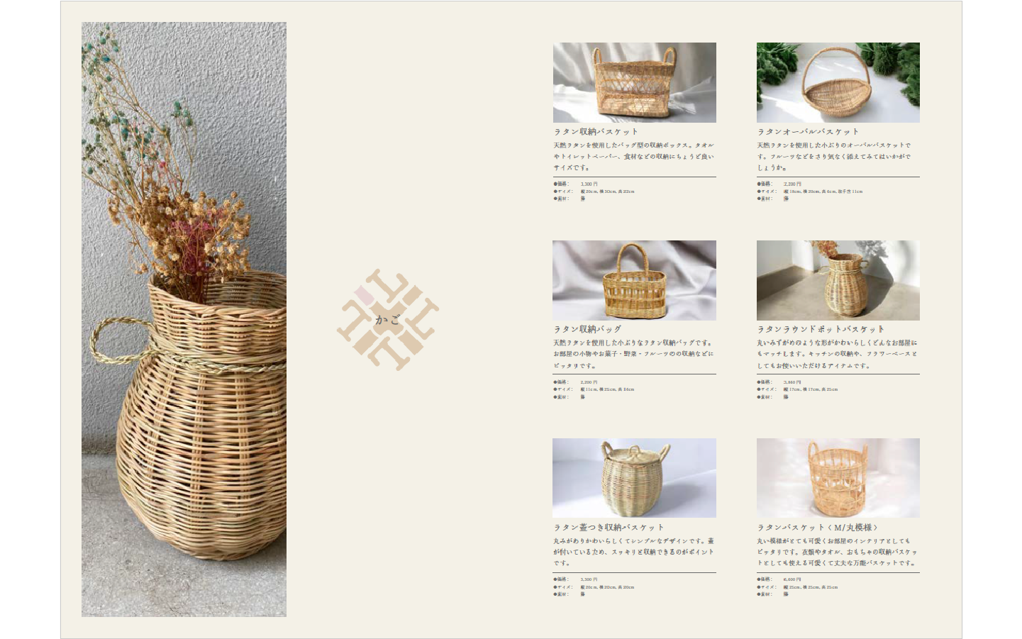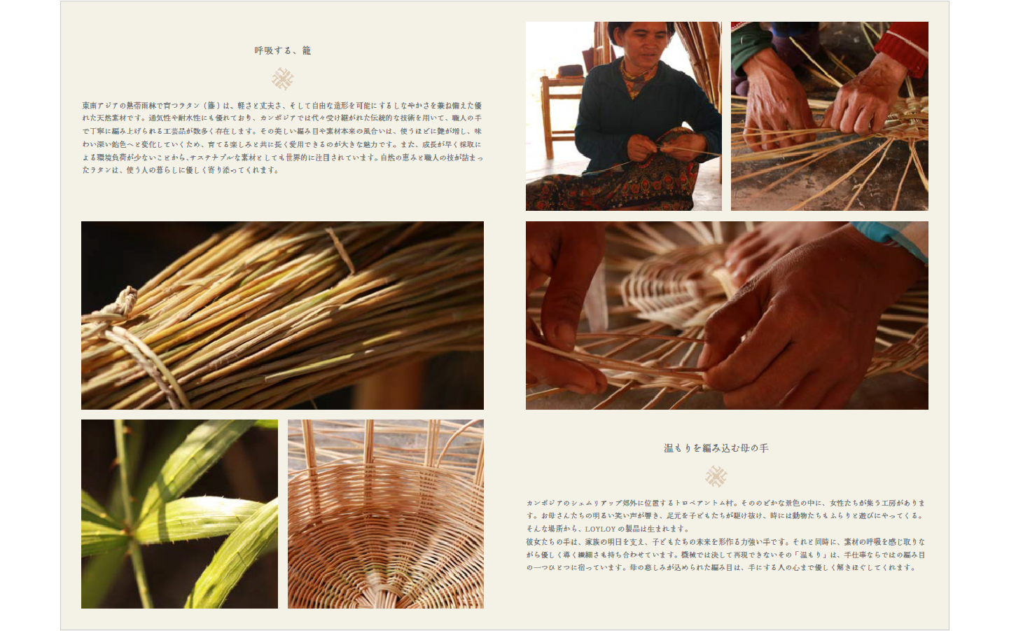商品だけでなく、素材(籐)の魅力、職人さんの技術力など、カンボジアの空気が伝わるように制作しました。